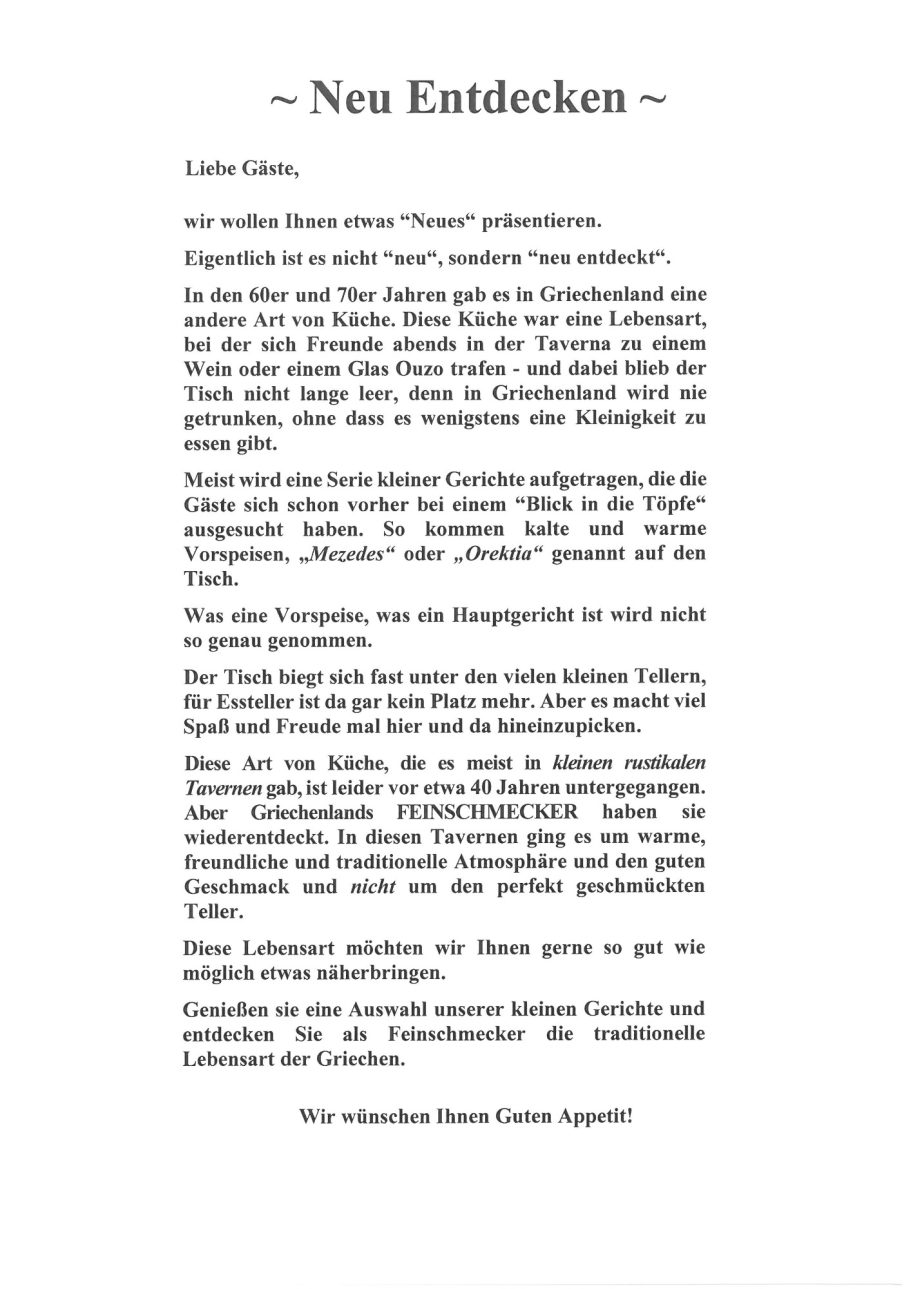 Genießen sie eine Auswahl unserer vielen kleinen Gerichte und entdecken Sie als FEINSCHMECKER die traditionelle Lebensart der Griechen